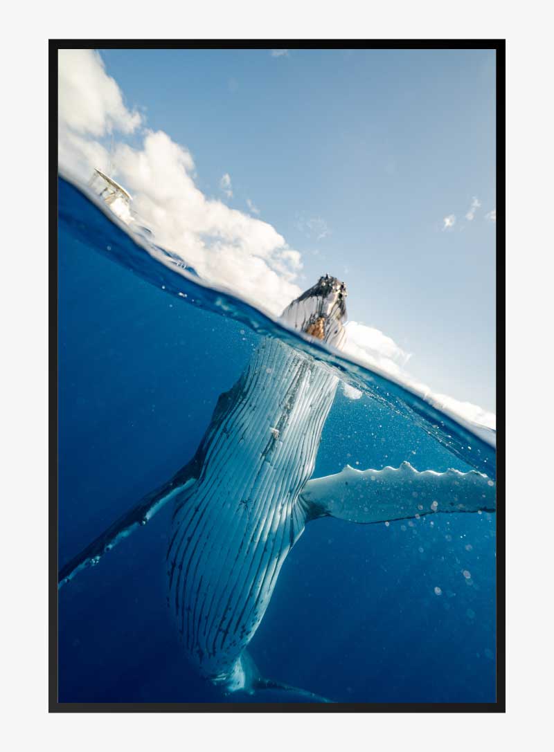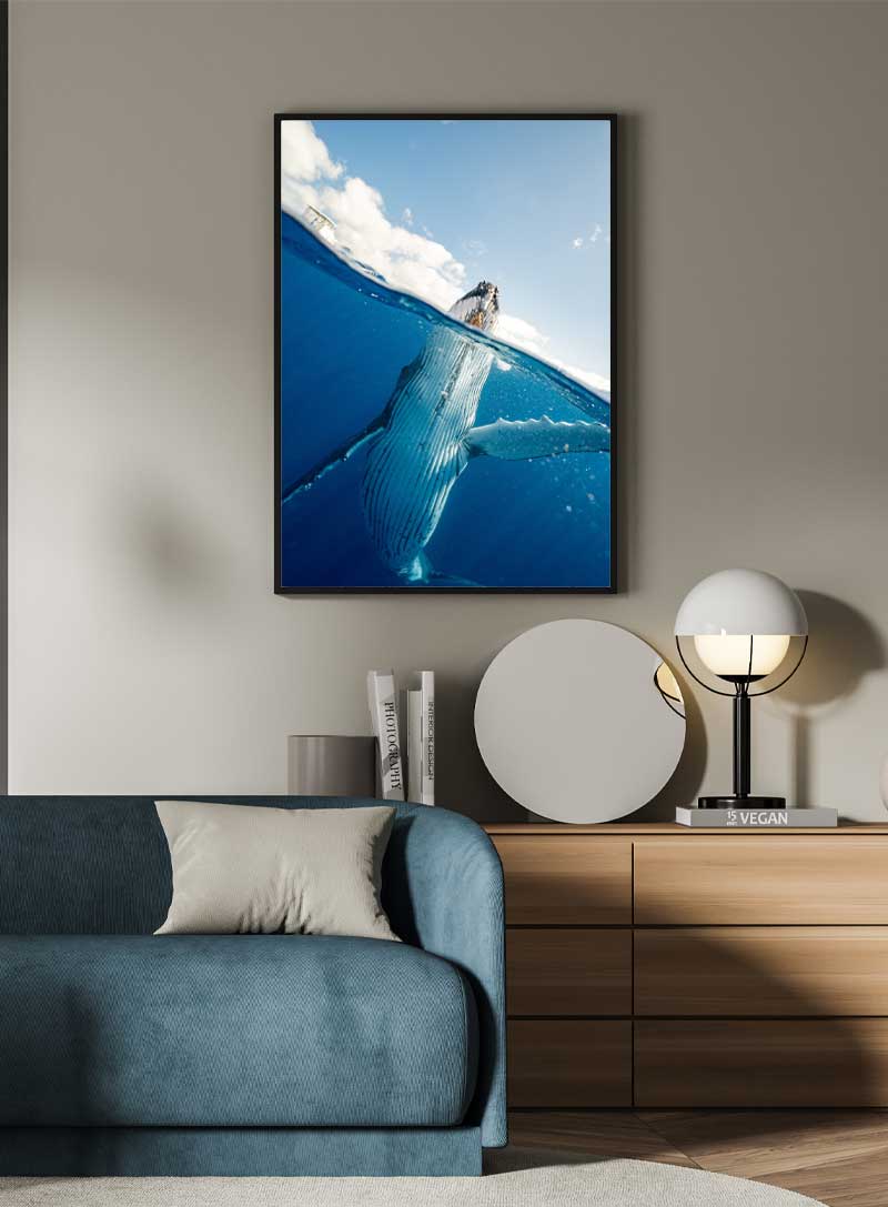 Dive into the depths of the ocean's wonders with this striking image of a whale's ascent. Let the calm of the deep blue waters and the gentle power of nature's leviathan fill your space with awe.