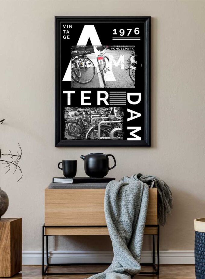 เติมเต็มพื้นที่ของคุณด้วยจิตวิญญาณของท้องถนนในอัมสเตอร์ดัม ที่ถ่ายทอดผ่านการเต้นรำอันไร้กาลเวลาของจักรยานและบรรยากาศของเมือง ชิ้นงานวินเทจสำหรับจิตวิญญาณแห่งเมือง.