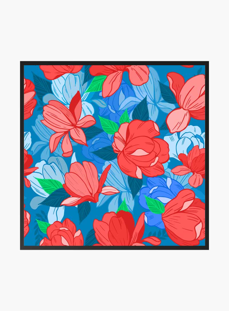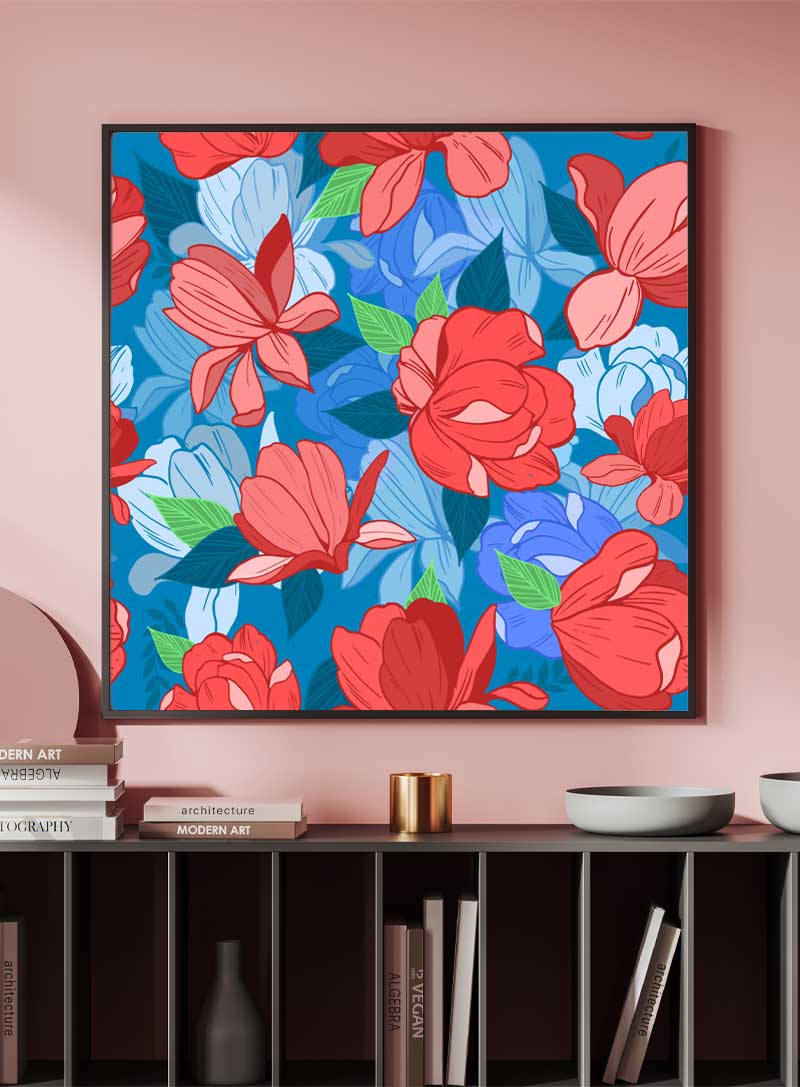 Delight your senses with a canvas where floral splendor dances, offering a lush visual symphony of reds and blues to enliven any space.