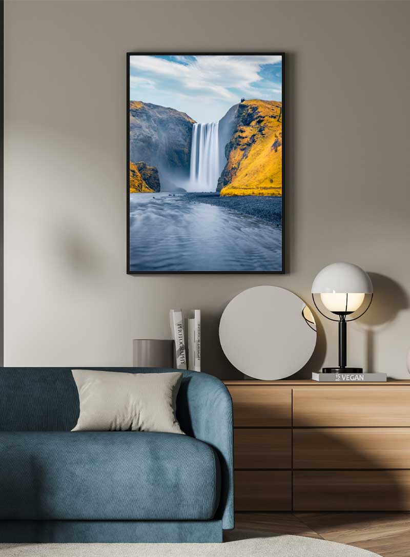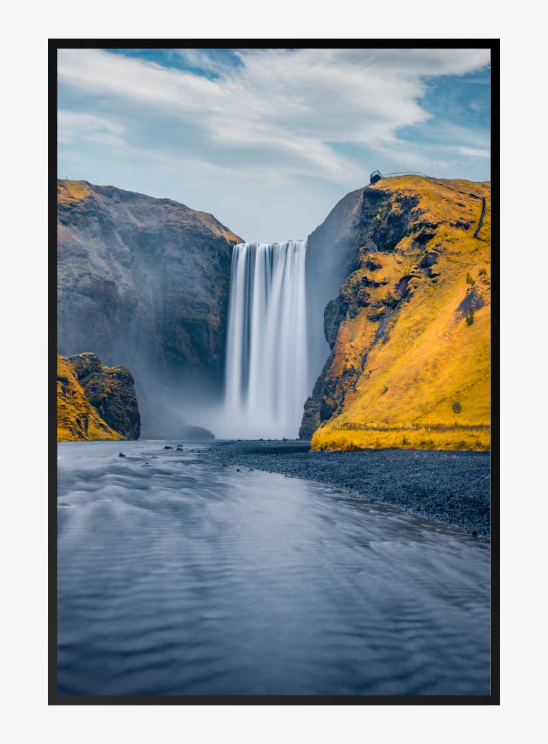 The sheer power of nature is evident in this print, where a waterfall tumbles down golden cliffs, embodying both the force and the beauty of the natural world.