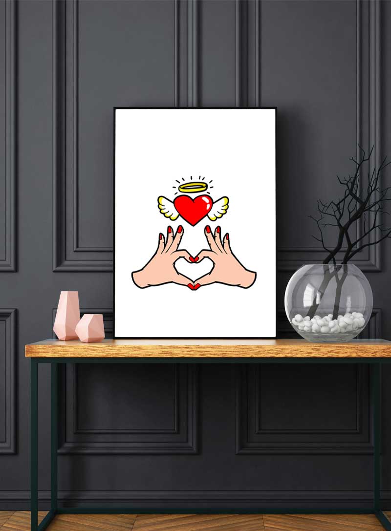 A celestial heart takes flight, encircled by a halo of purity and cradled by tender gestures of love, an intimate symbol that sweetens the sanctuary of your home.