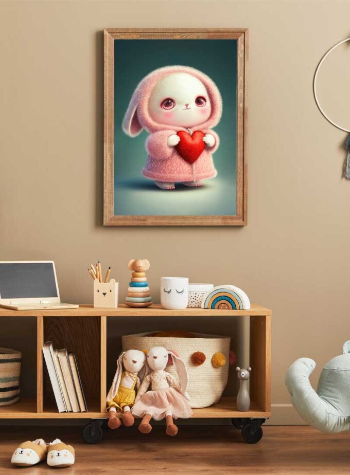 Enveloped in a soft pink hoodie, this adorable bunny with soulful eyes clutching a shimmering red heart is a tender messenger of love, ideal for warming the heart of your space.