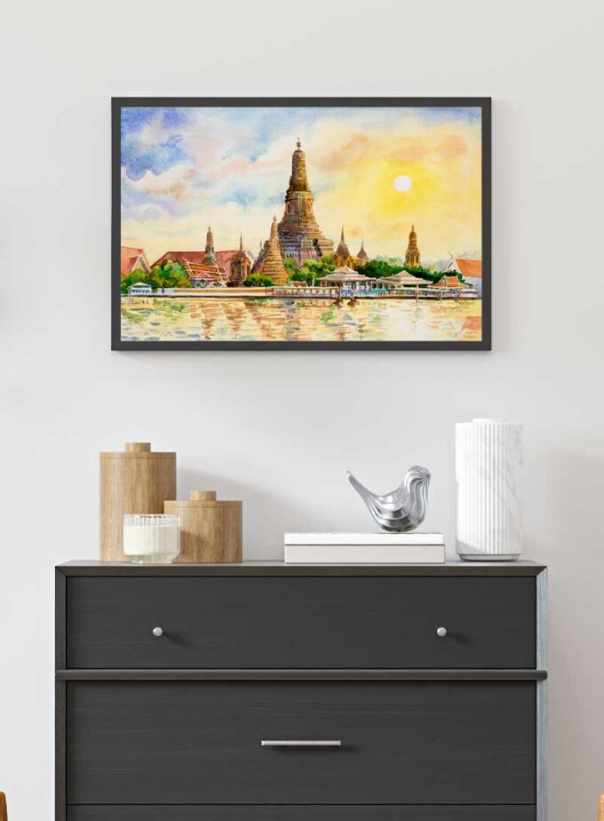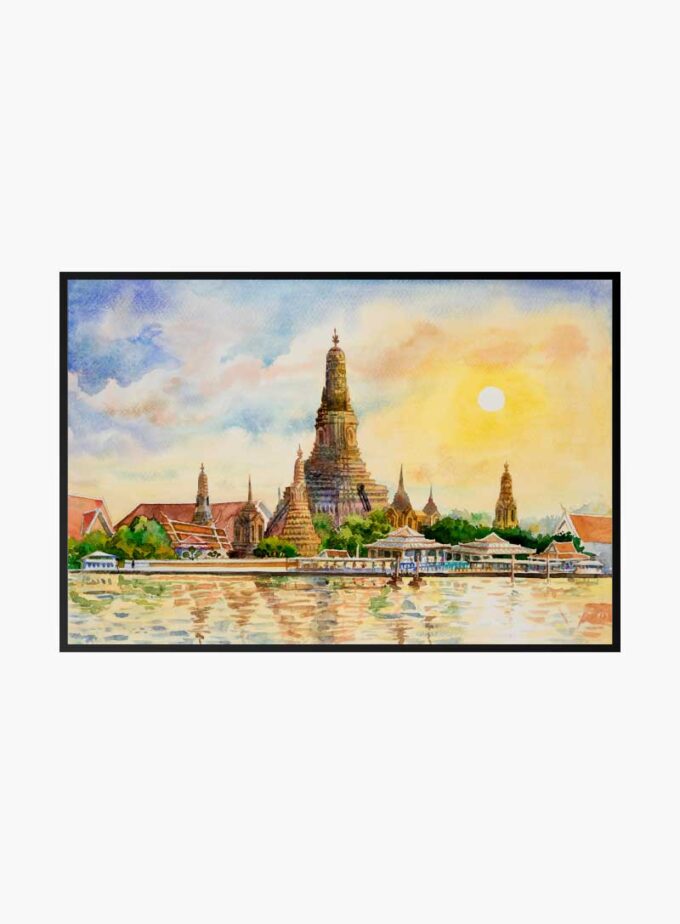 Embrace the warm glow of sunrise with this vibrant watercolor of Wat Arun, Bangkok's iconic Temple of Dawn, illuminating any space with its cultural splendor.