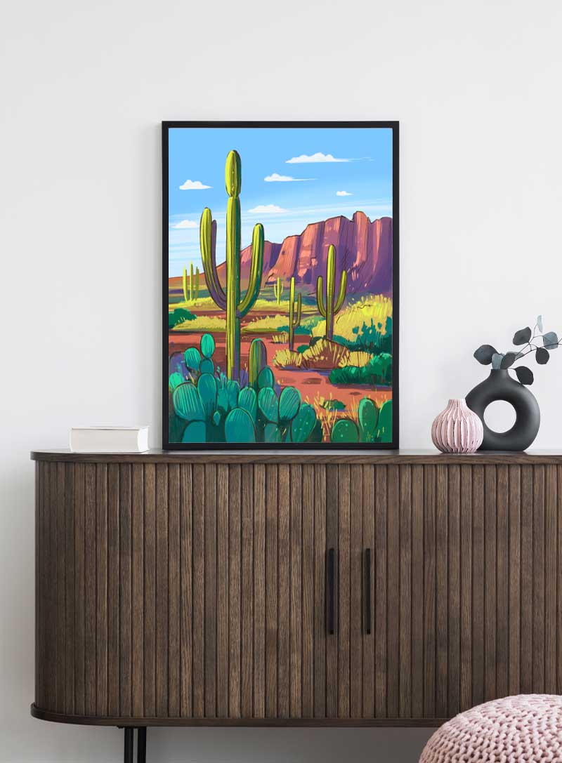 Immerse yourself in the tranquil beauty of the desert, where towering cacti and sun-kissed mesas evoke a sense of enduring calm.
