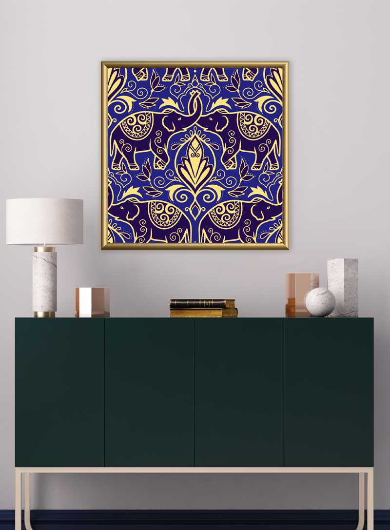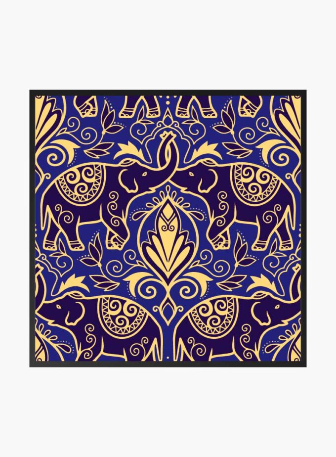 A regal tapestry of golden elephants set against a midnight blue, this piece radiates the mystique and majesty of ancient tales.