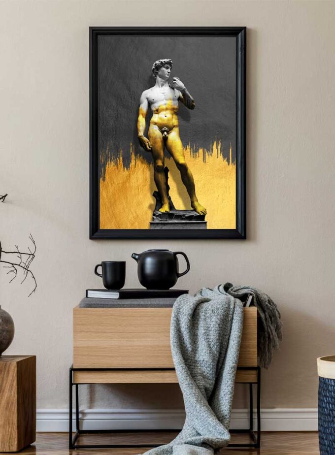 In "Gilded Epoch," a statue stands timelessly, draped in gold, blending classic beauty with modern abstract, a juxtaposition that commands any room.