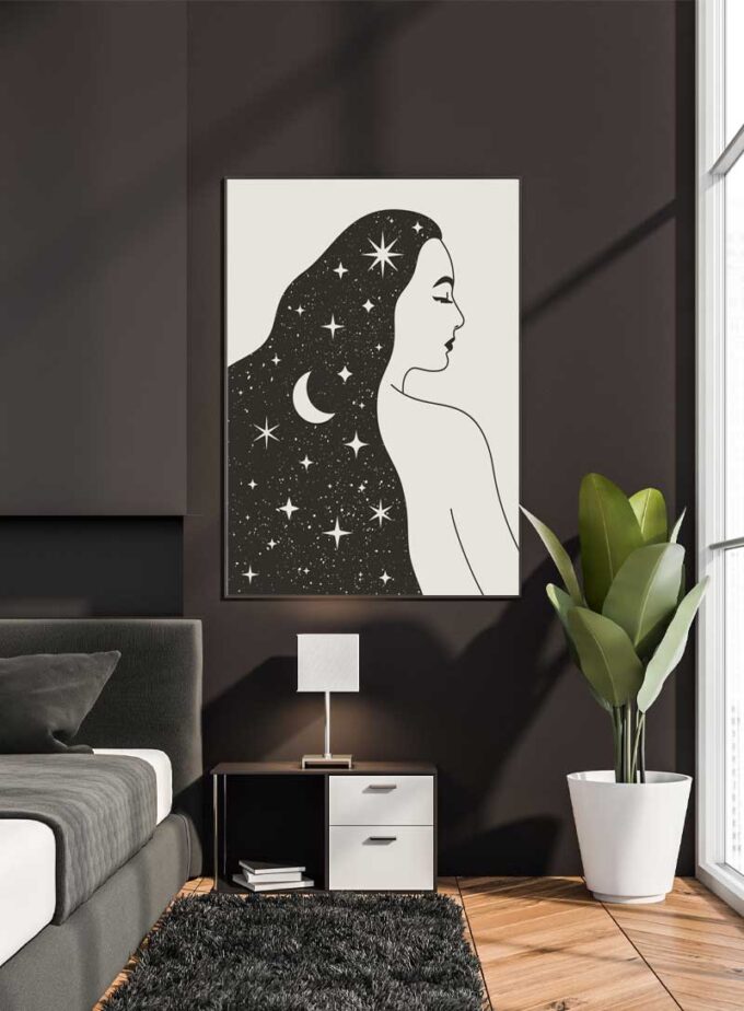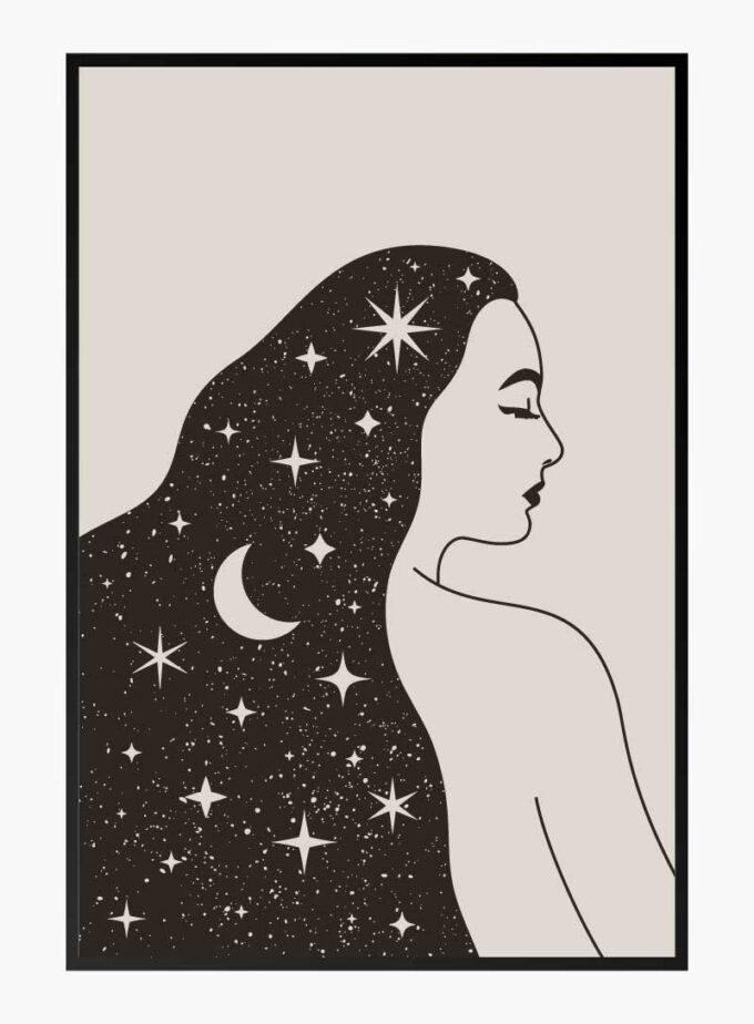 This enchanting artwork captures the serene profile of a woman with her hair flowing like the night sky, adorned with stars and a crescent moon. It brings a sense of tranquility and wonder to any space.