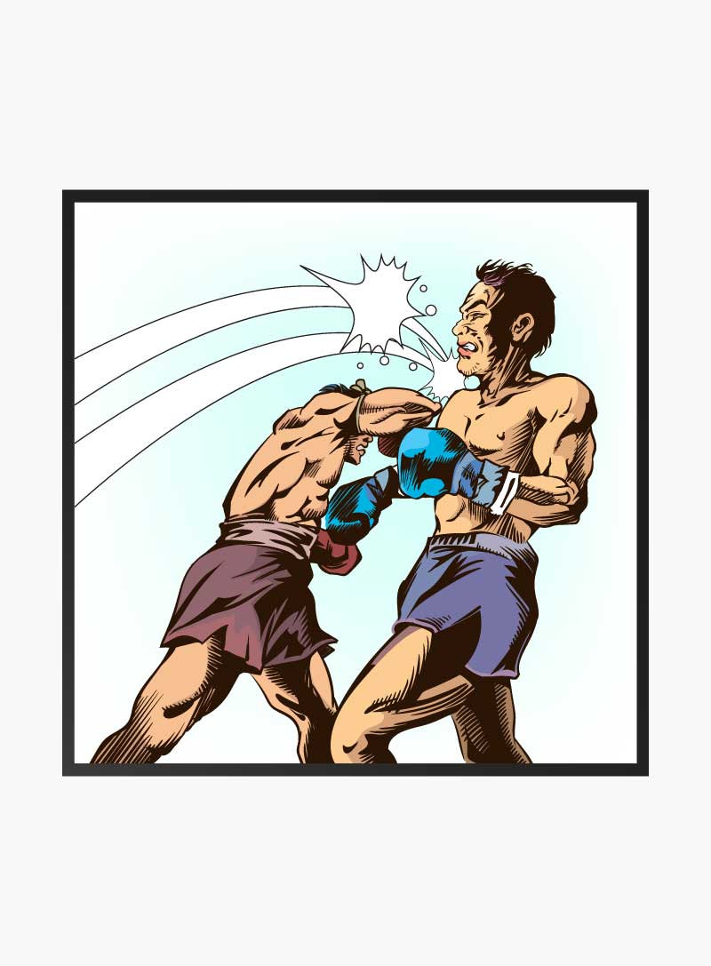 Dynamic energy bursts forth as two Thai boxers engage in a timeless dance of strength and skill, captured in vivid comic style.