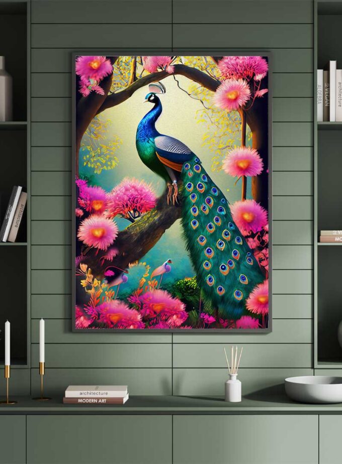 A stunning tapestry of nature's splendor unfolds in this artwork, where a vibrant peacock stands amid blossoms, inviting a gaze into the wild's enchanting beauty.