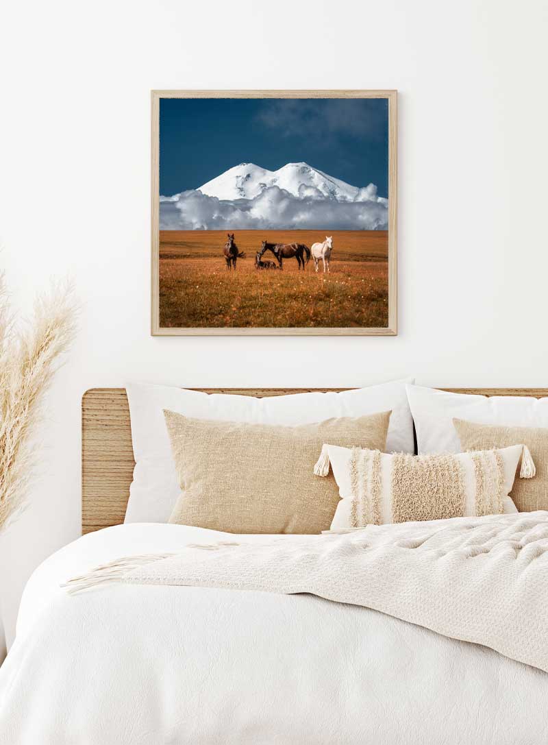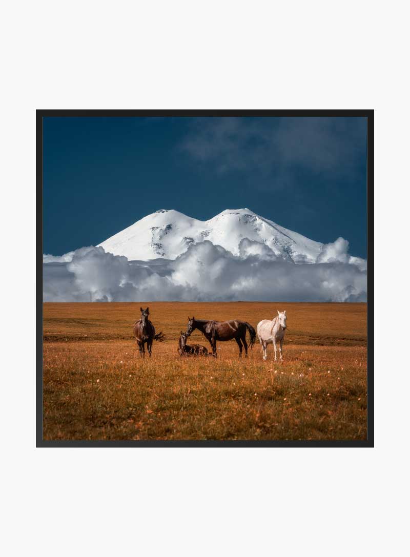 Witness the serene grandeur of nature in this captivating scene where horses roam freely before a majestic mountain backdrop. This image embodies the spirit of freedom and the sublime, perfect for inspiring awe in any setting.