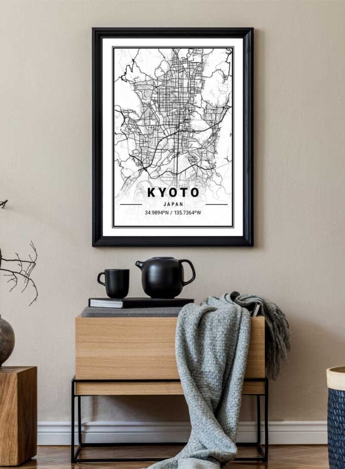 Traverse the ancient streets of Kyoto through this monochrome map. Its serene complexity brings a touch of Zen sophistication to your dwelling, blending tradition with modern décor.