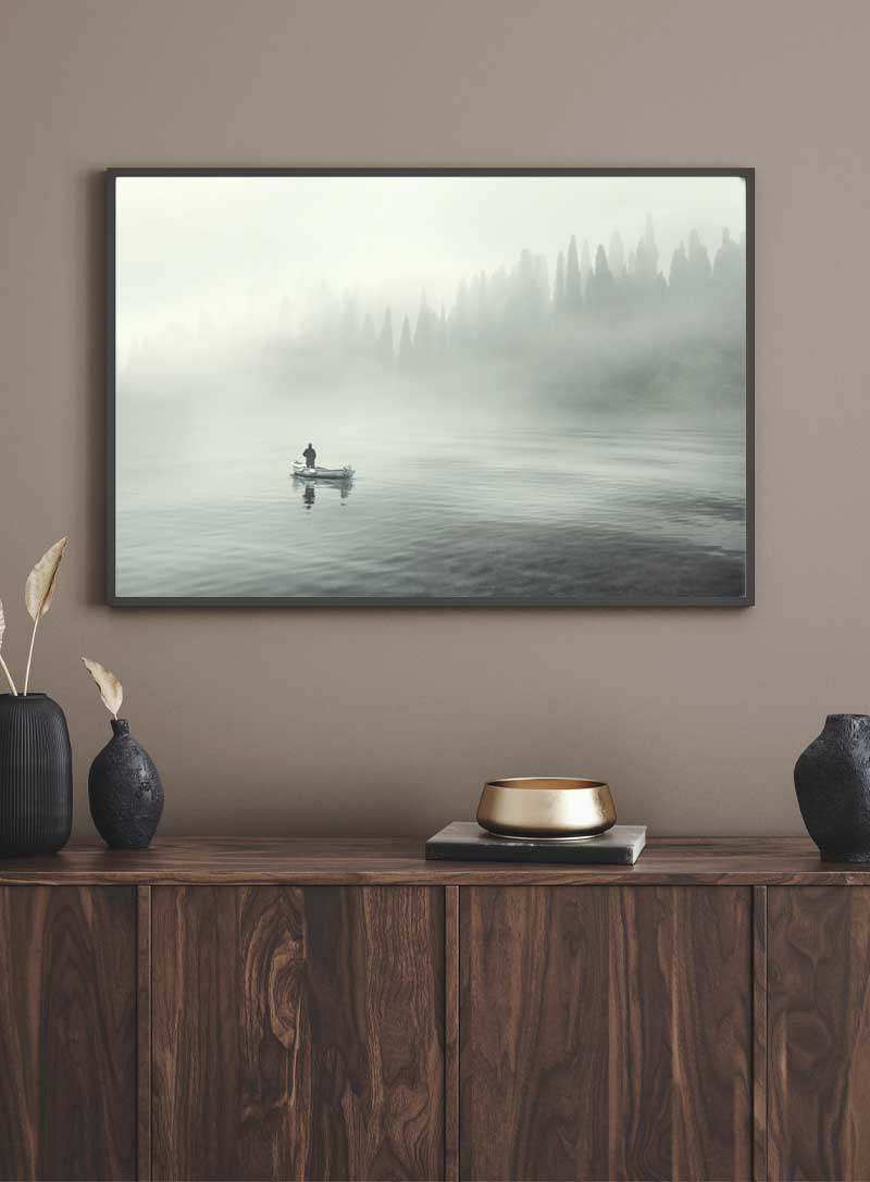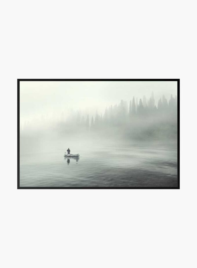 A lone rower drifts on a mirror-like lake, enveloped by a symphony of mist and whispering pines, a serene escape into nature's embrace.