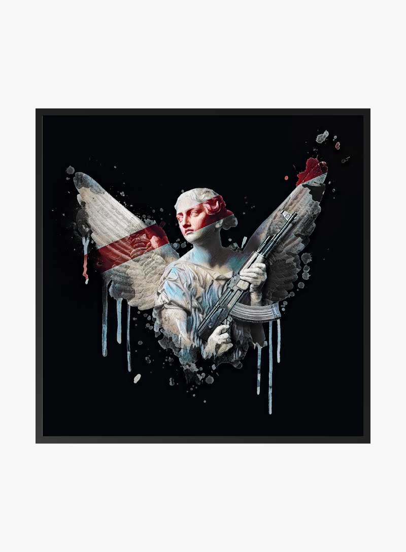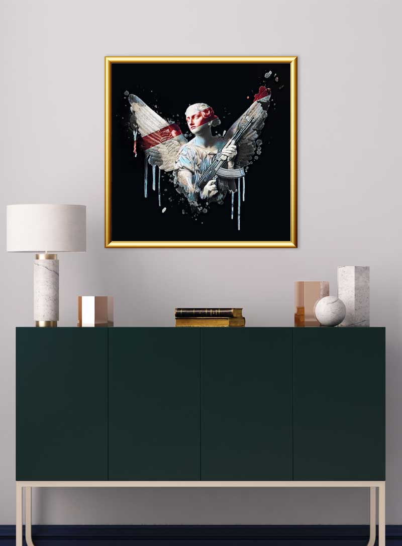 A statueque warrior muse emerges with splattered wings, invoking a powerful narrative on the canvas of your wall.