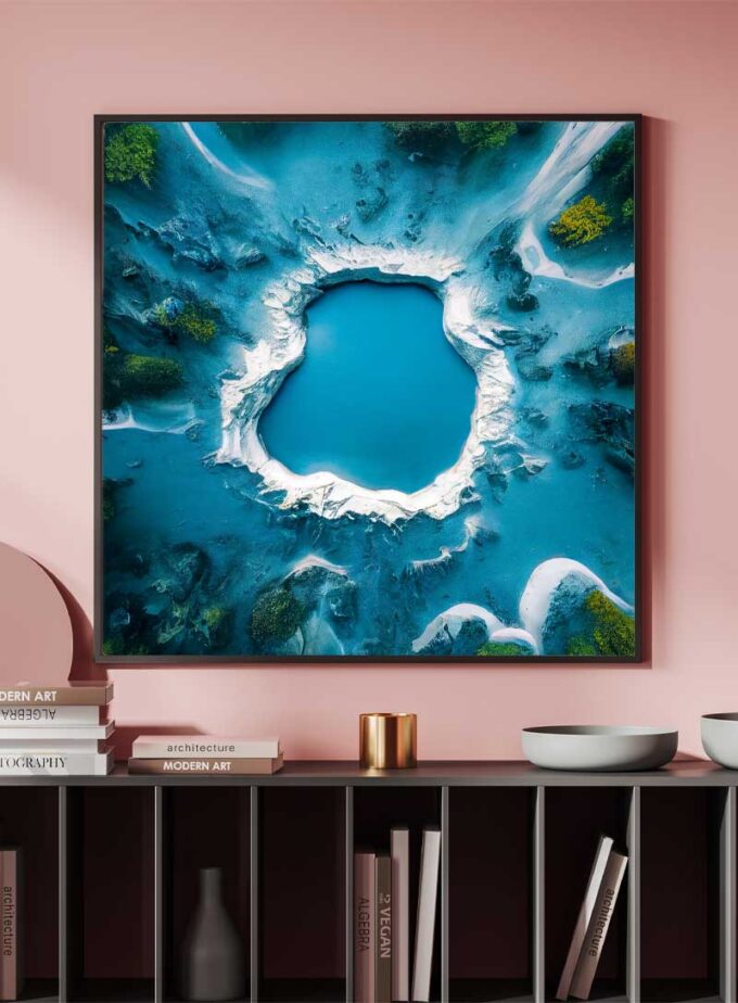 This print reveals a secluded pool mirroring the sky, a hidden gem where earth and heaven converge in a tranquil tableau, perfect for adding a touch of serenity to your space.