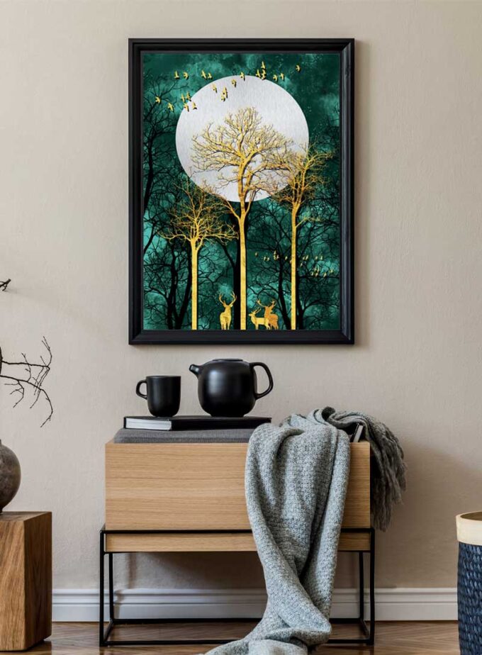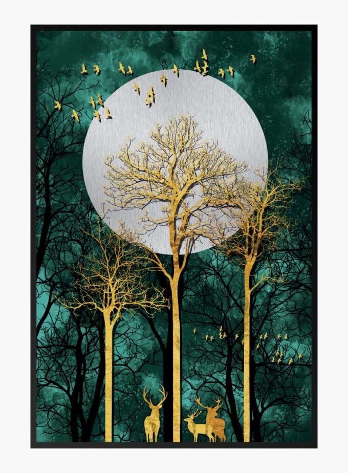 Under the glow of a luminous moon, golden trees and silent stags stand in tranquil unity, weaving a serene nocturnal tapestry.