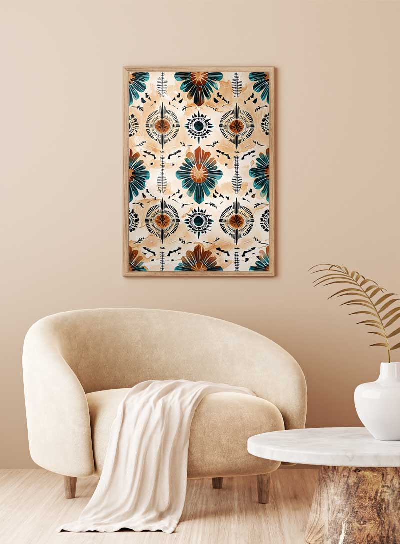A mesmerizing fusion of floral motifs and compass-inspired designs, this artwork radiates harmony and direction. With earthy browns, turquoise accents, and intricate details, it evokes both natural beauty and the spirit of exploration. Perfect for inspiring adventure and balance in any space.
