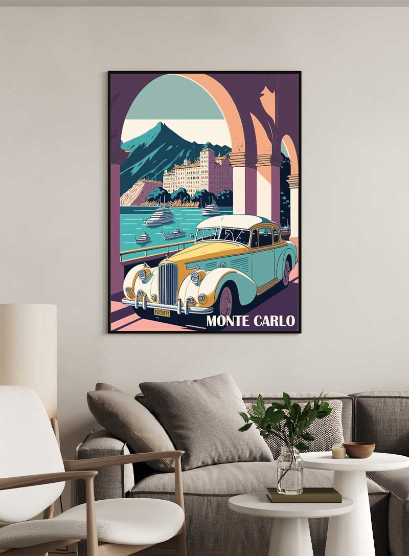 Capture the opulent essence of Monte Carlo with this evocative piece, where vintage luxury meets the azure allure of the Mediterranean.