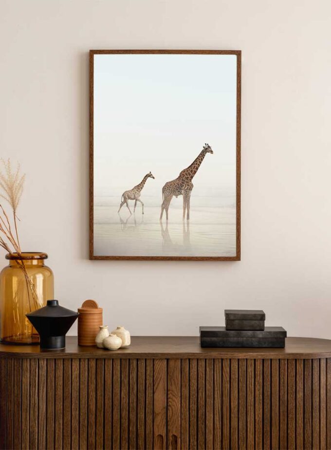 Evoke the serenity of a misty savannah sunrise with this minimalist portrayal of giraffes. Perfect for bringing a touch of tranquil wilderness to your urban dwelling.