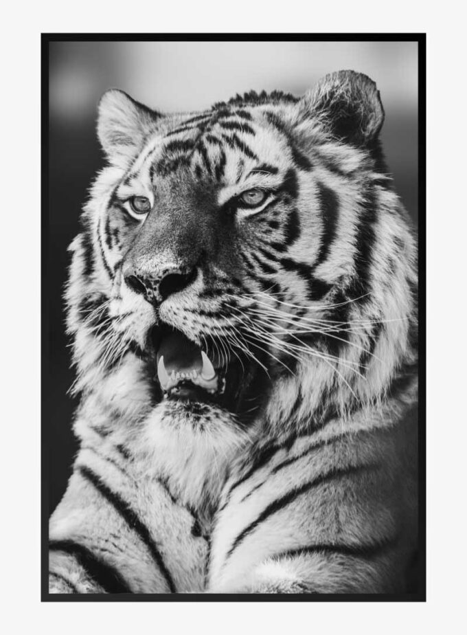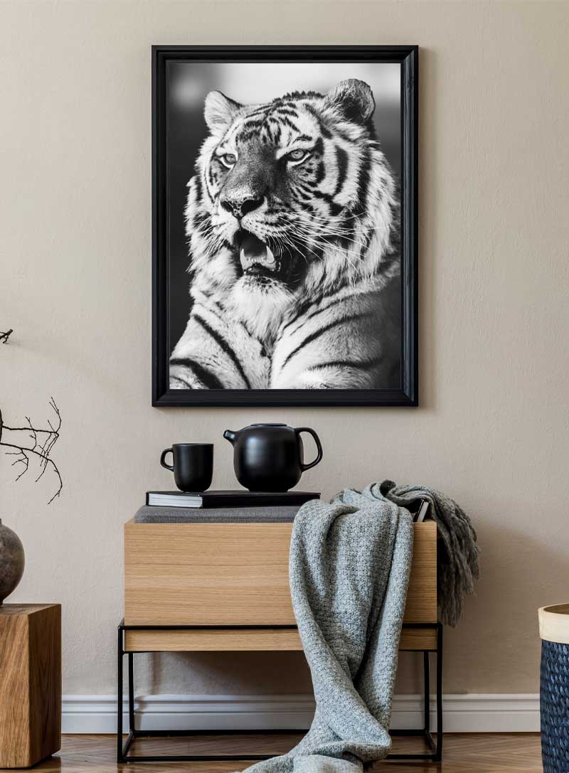 This arresting black and white portrayal captures the raw essence of the tiger. Its silent intensity is a bold statement, perfect for an evocative and sophisticated addition to your living space.