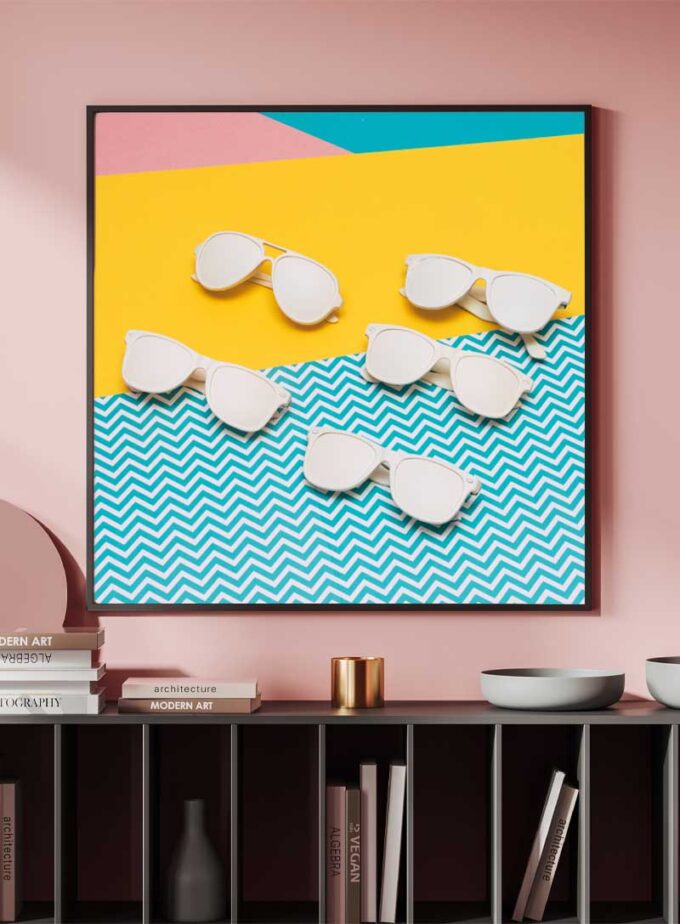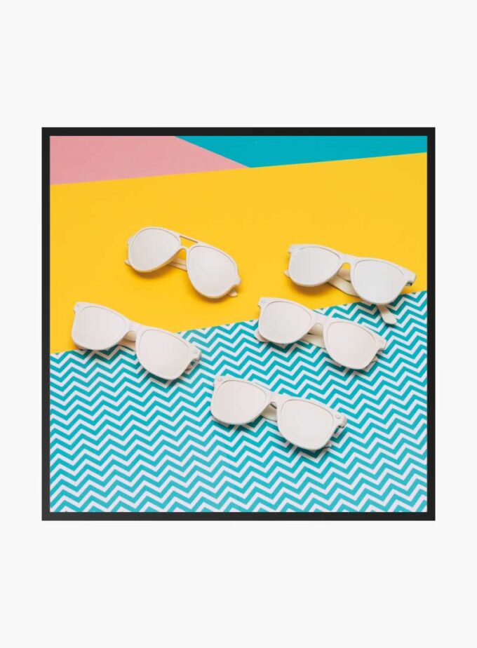 An array of white sunglasses lies playfully on a canvas of bold geometry, embodying the vibrant spirit of sunny escapades.