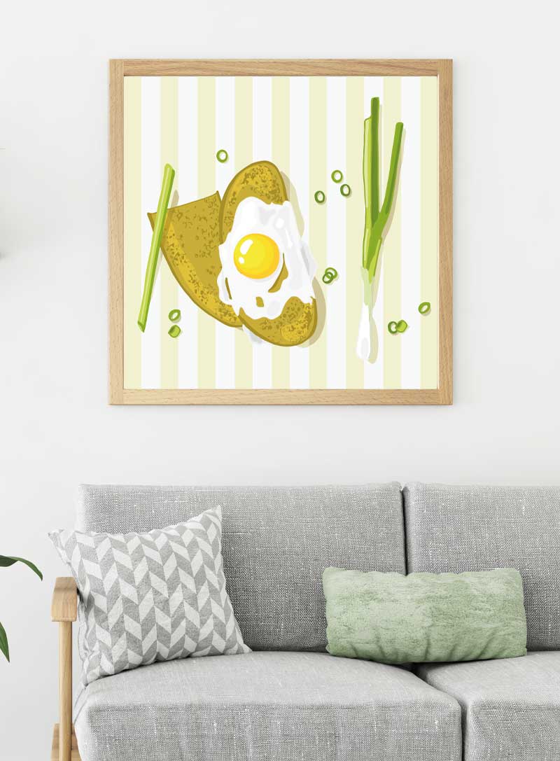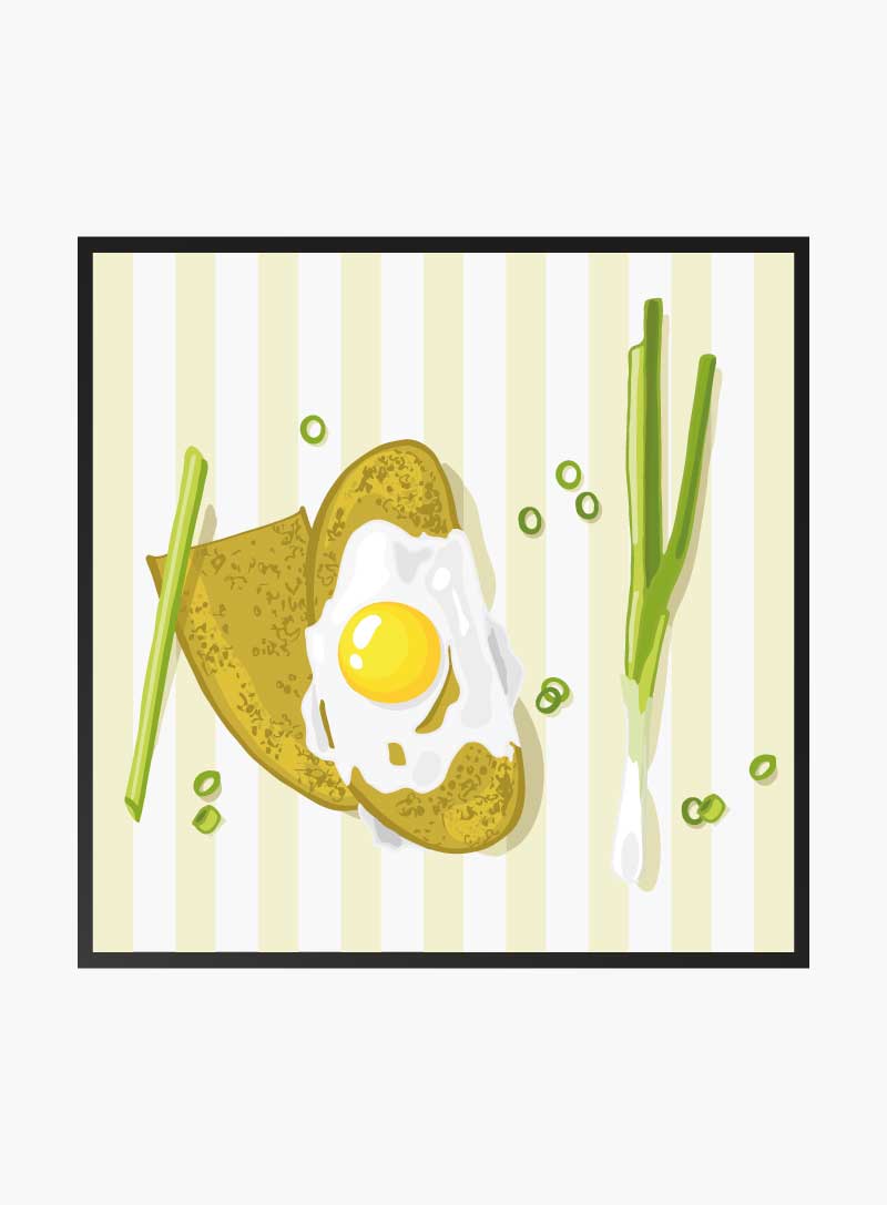 Transform your kitchen with this appetizing artwork, a playful homage to the simple joy of a perfectly fried egg on toast.