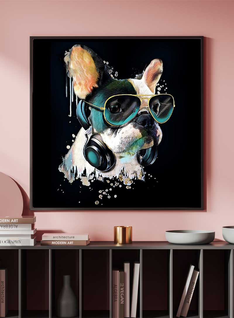 Embrace the cool vibes with this artwork featuring a bulldog who's all about the rhythm. This piece captures a fusion of street art flair and animal charisma—perfect for a touch of urban chic.