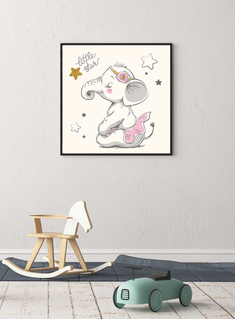 Enchant your nursery with this adorable, starry-eyed elephant, a tender symbol of gentle dreams and celestial playfulness. A charming addition to inspire wonder and smiles.