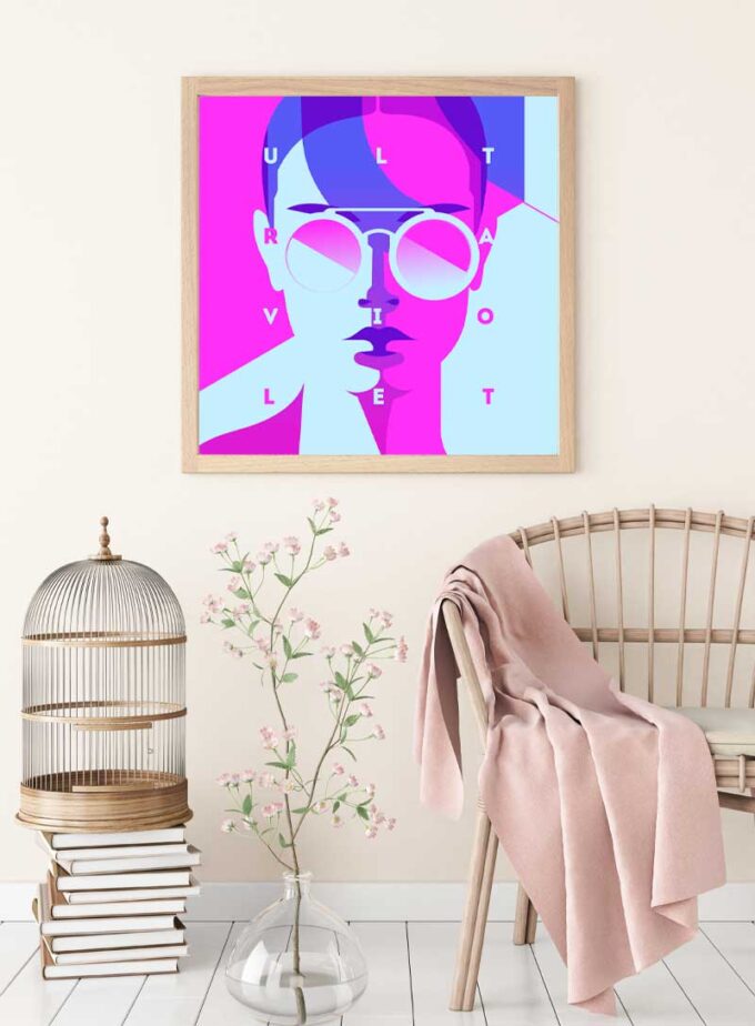 A bold fusion of purple and pink shades frames a modern visage, offering an avant-garde accent to any contemporary space.