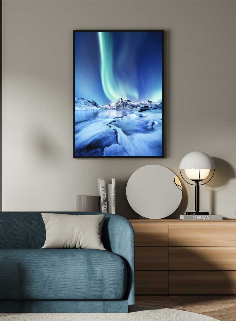 ภาพพิมพ์นี้ถ่ายทอดการเต้นรำอันงดงามของแสงเหนือ ดุจดั่งซิมโฟนีเงียบงันเหนืออาณาจักรน้ำแข็ง เติมเต็มห้องใดๆ ด้วยมนต์เสน่ห์แห่งค่ำคืนขั้วโลก.