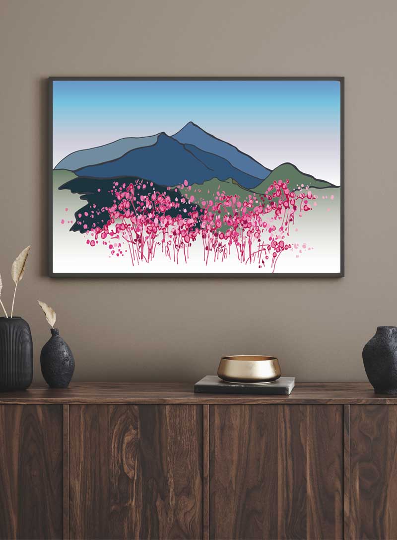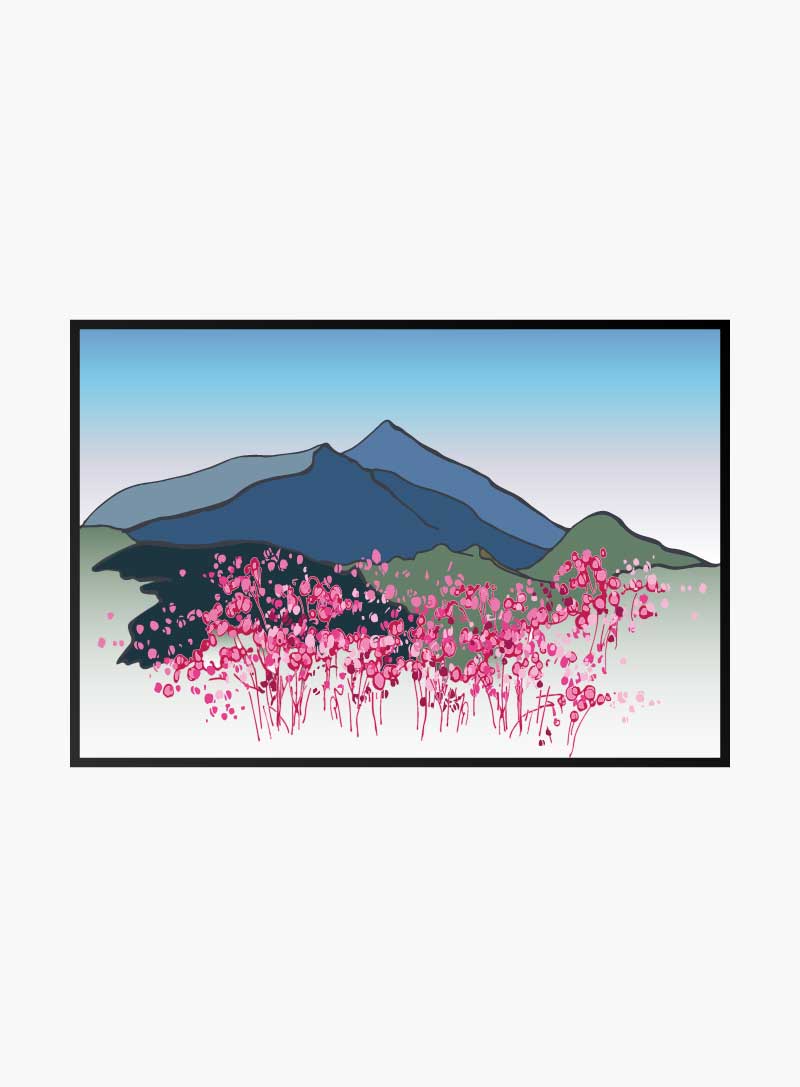 ลองชมความงามอันสงบเงียบของภูเขาที่ปกคลุมด้วยละอองดอกไม้สีชมพู ภาพที่บอกเล่าถึงความงดงามอันสงบและยั่งยืนของธรรมชาติ.