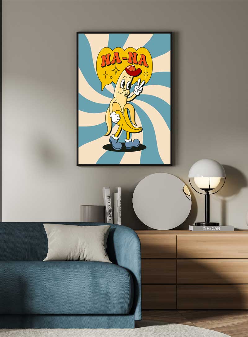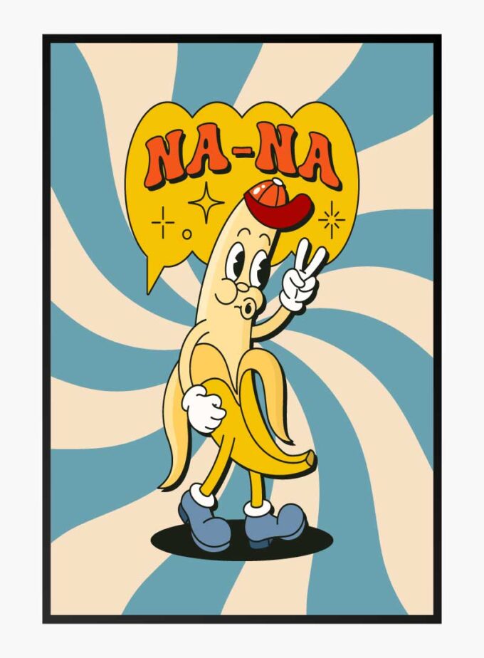 เพิ่มความสนุกสนานให้กับพื้นที่ของคุณด้วยตัวการ์ตูนกล้วยสุดน่ารักนี้ โดดเด่นด้วยสีเหลือง สีฟ้า และสีส้มสดใส ให้ความรู้สึกย้อนยุคที่มีเสน่ห์และอารมณ์ขัน.
