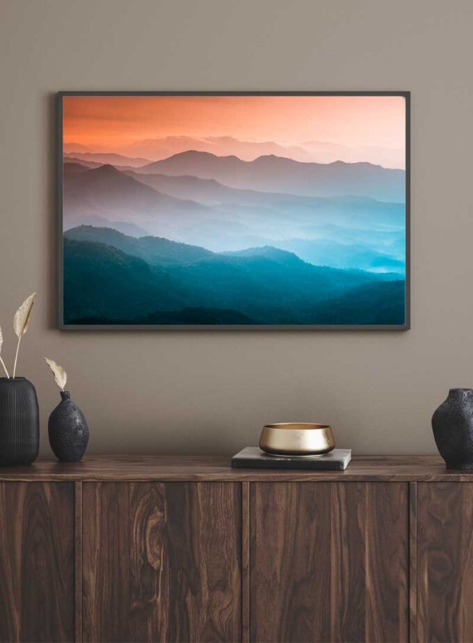สัมผัสความสงบสุขด้วยทิวทัศน์อันงดงามนี้ ที่ซึ่งแสงอรุณรุ่งส่องลงมายังหุบเขาที่ปกคลุมไปด้วยหมอก เป็นองค์ประกอบอันงดงามที่จะเติมเต็มห้องใดๆ ก็ตามด้วยความสงบสุขแห่งการตื่นขึ้นของธรรมชาติ.