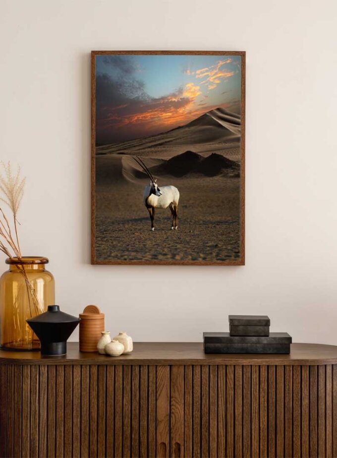 เมื่อวันใกล้สิ้นสุดลง ละมั่งโอริกซ์ตัวหนึ่งยืนนิ่งสงบอยู่ท่ามกลางเนินทรายกว้างใหญ่และแสงอาทิตย์ยามเย็นที่เจิดจ้า ภาพอันน่าประทับใจนี้มอบช่วงเวลาแห่งการใคร่ครวญและความงามอันบริสุทธิ์ของธรรมชาติให้แก่ทุกพื้นที่.