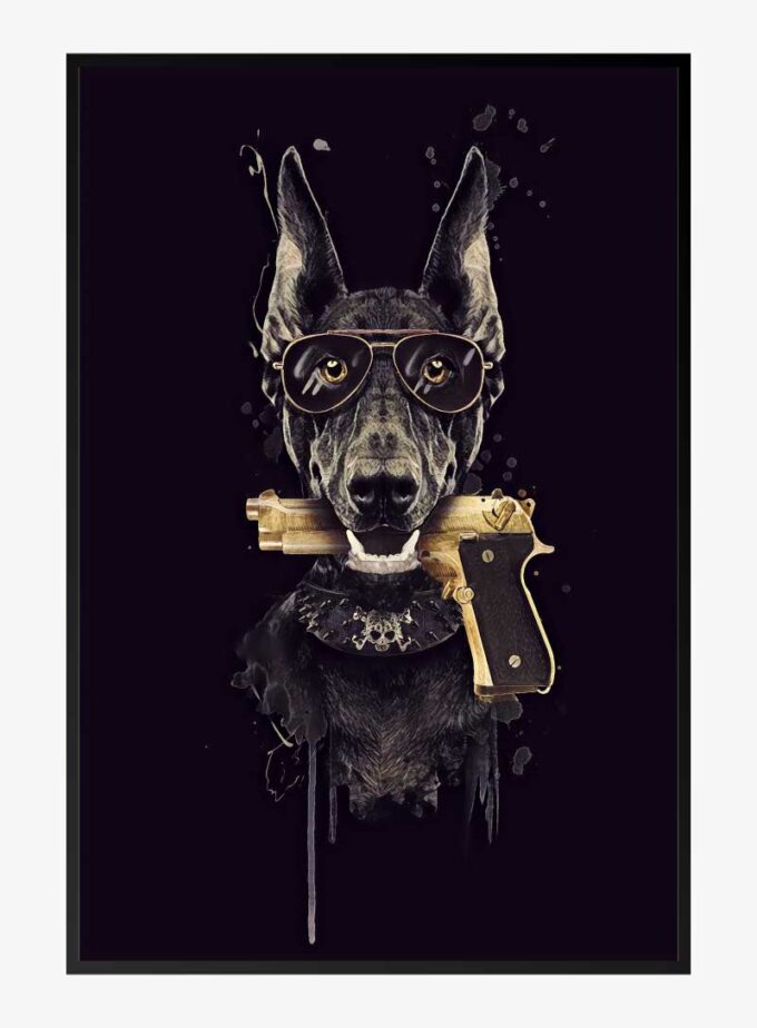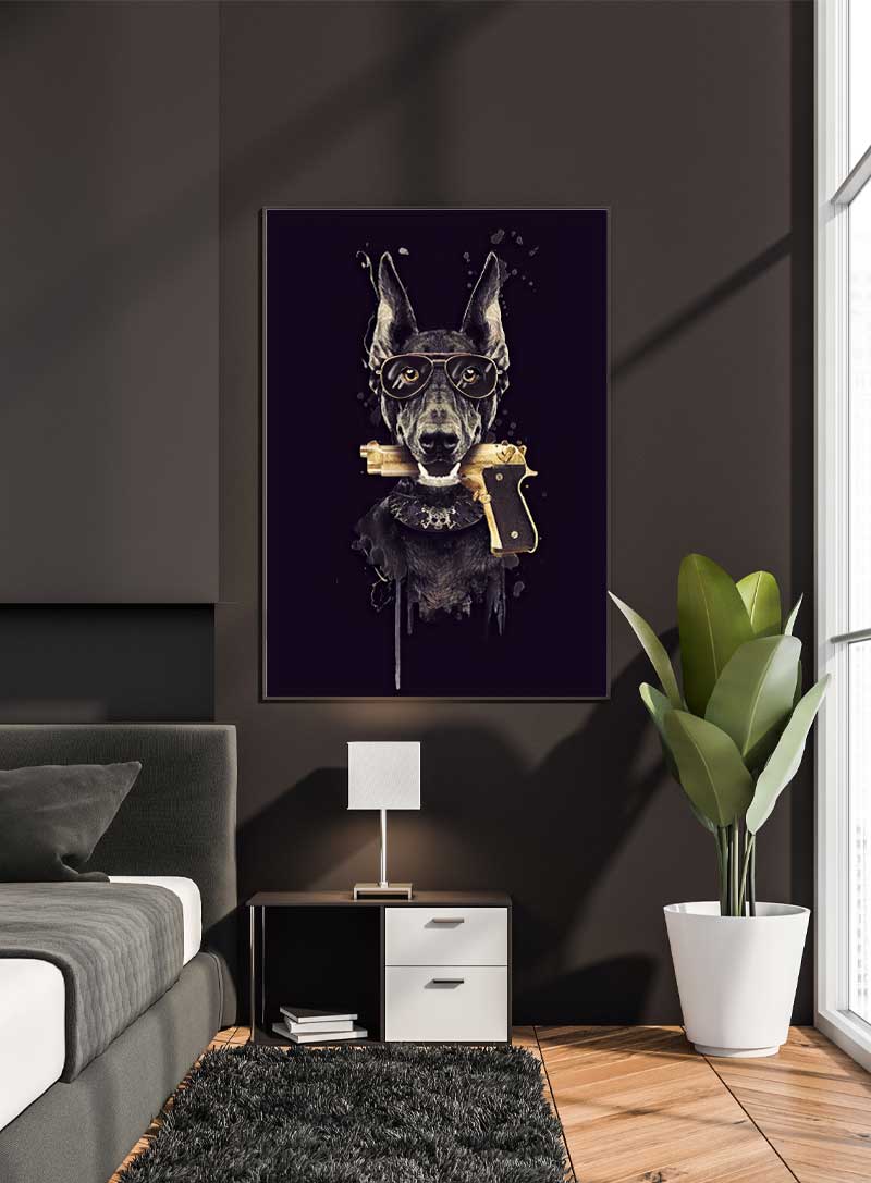 เติมเสน่ห์ให้กับพื้นที่ของคุณด้วยภาพเหมือนอันโดดเด่นที่แสดงถึงความระมัดระวัง ผู้พิทักษ์ที่ซื่อสัตย์ซึ่งถูกล้อมกรอบด้วยสีสันยามแสงจันทร์.