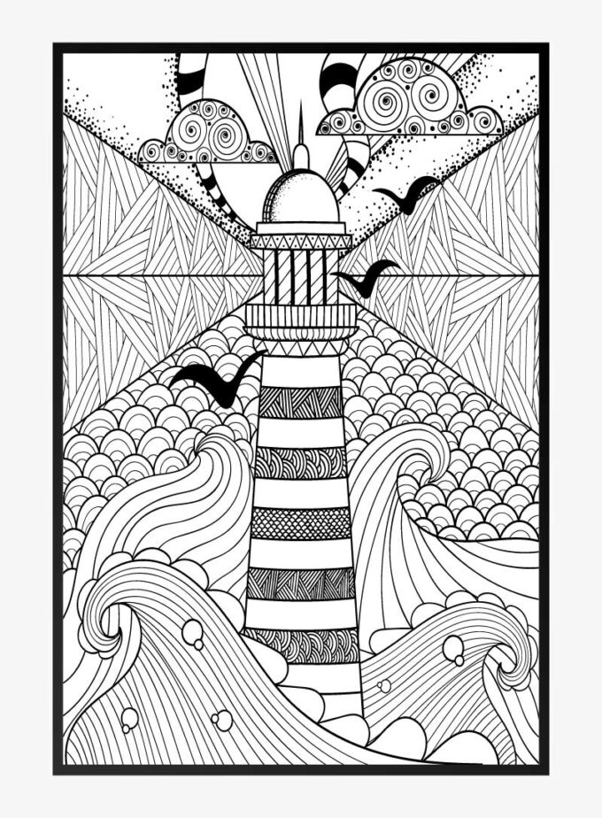 งานศิลปะหมึกที่ซับซ้อนนี้ถ่ายทอดการเต้นรำอันเป็นนิรันดร์ของทะเลและท้องฟ้า ประภาคารที่ตั้งตระหง่านท่ามกลางกระแสน้ำขึ้นลงของธรรมชาติ.