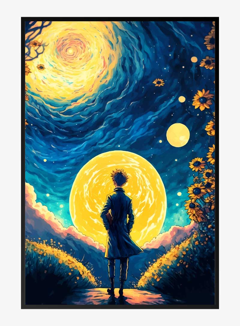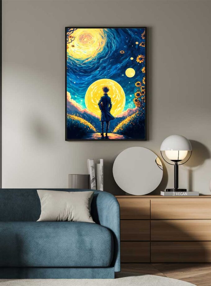 ดื่มด่ำไปกับบทเพลงแห่งราตรีด้วยงานศิลปะชิ้นนี้ ที่ถ่ายทอดภาพบุคคลโดดเดี่ยวท่ามกลางกลุ่มดาวและดอกไม้ที่พลิ้วไหวอย่างงดงาม ภาพนี้จะเติมเต็มห้องใดๆ ก็ตามด้วยความอัศจรรย์และความงดงามอันเงียบสงบของห้วงฝันแห่งจักรวาล.