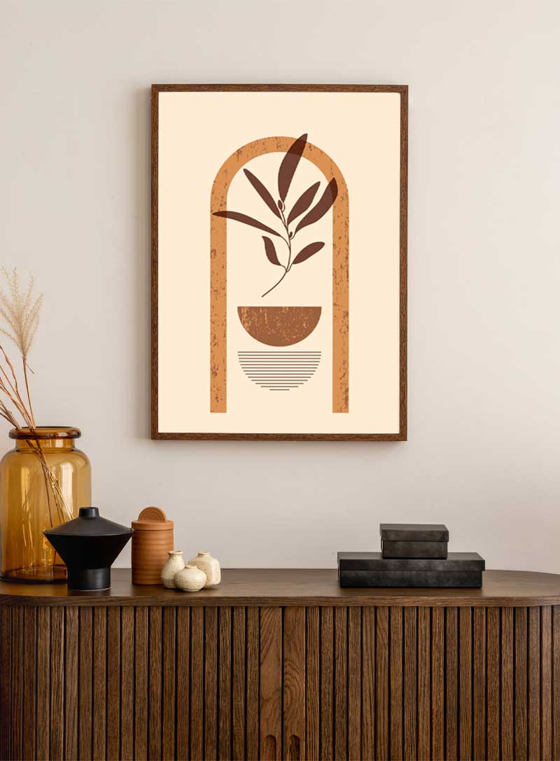 งานศิลปะสไตล์มินิมอลชิ้นนี้มอบความรู้สึกสงบและสมดุล สีน้ำตาลและสีเบจโทนธรรมชาติ ผสานกับรูปทรงเรขาคณิตเรียบง่าย สร้างบรรยากาศที่สงบและชวนให้ครุ่นคิด.