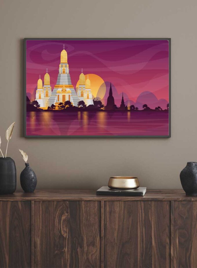 วัดอรุณราชวรมรามณะอย่างสง่างามท่ามกลางท้องฟ้าสีม่วงหม่น เงาของวัดเป็นสัญลักษณ์แห่งความสงบสุขและความสง่างามทางจิตวิญญาณที่อยู่เหนือกาลเวลาในบ้านของคุณ.