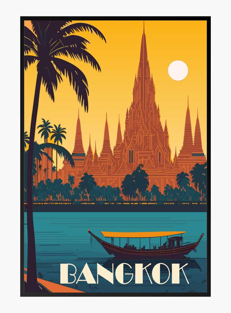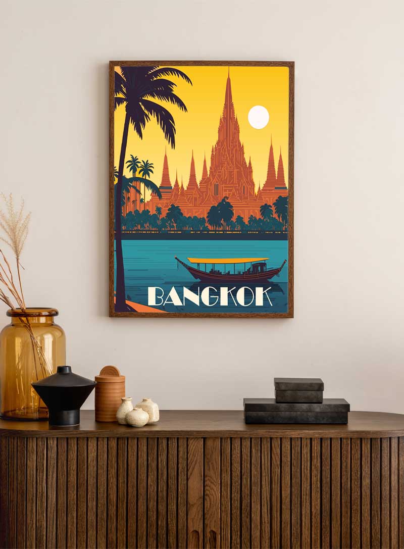 ภาพพิมพ์นี้จะพาคุณไปสัมผัสกับพระอาทิตย์ตกดินอันสงบเงียบของกรุงเทพฯ ที่ซึ่งยอดเจดีย์เป็นเงาดำตัดกับท้องฟ้าสีทอง ราวกับเป็นภาพสะท้อนเรื่องราวความรุ่งเรืองในอดีต.