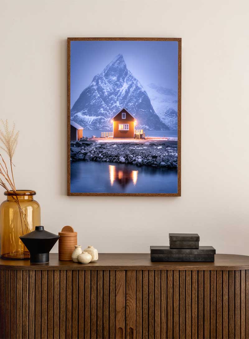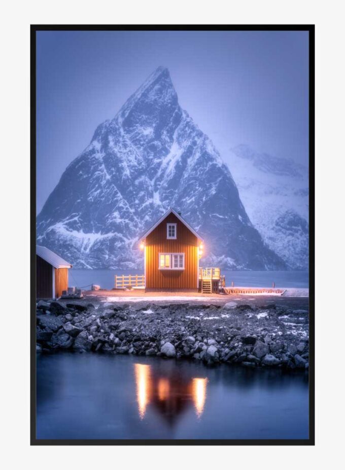 กระท่อมโดดเดี่ยวหลังหนึ่งส่องแสงอบอุ่นท่ามกลางยอดเขาน้ำแข็งสูงตระหง่าน เป็นเสมือนประภาคารแห่งความสงบและสบายในดินแดนทุรกันดาร ภาพพิมพ์นี้ถ่ายทอดความรู้สึกทั้งประหลาดใจและอบอุ่นไปพร้อมๆ กัน.
