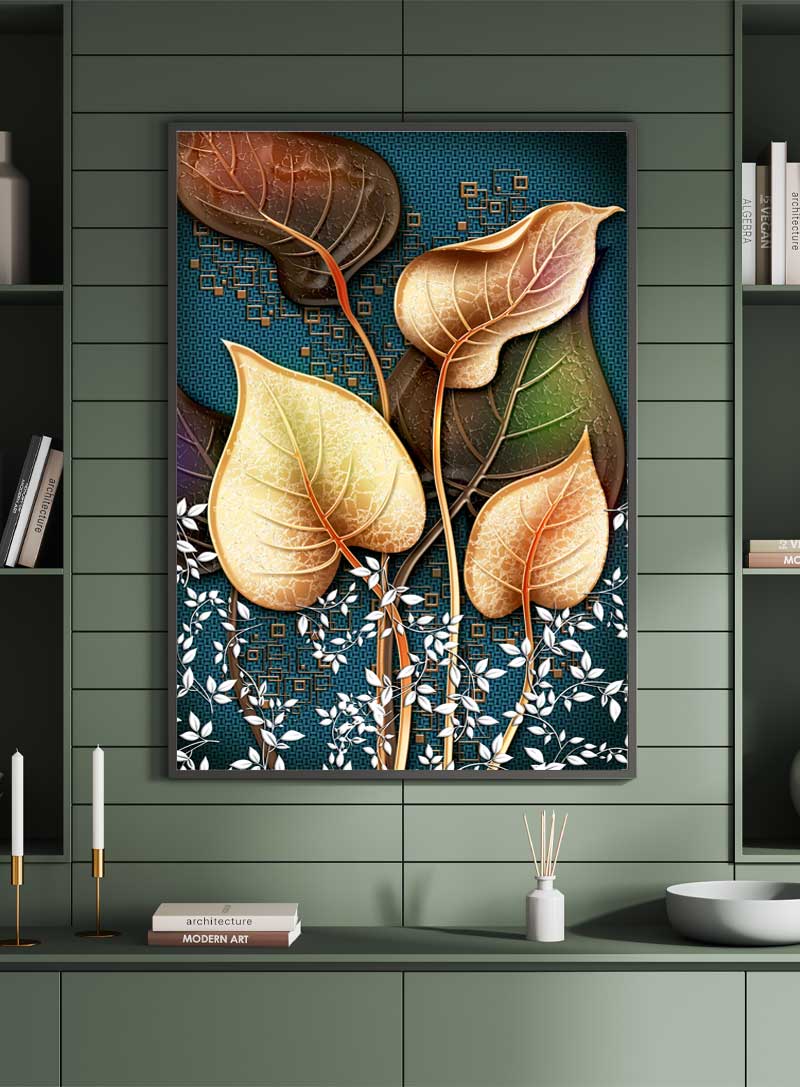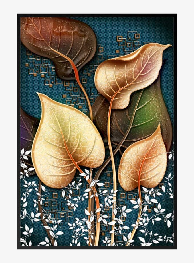 งานศิลปะชิ้นเยี่ยมนี้ถ่ายทอดความงดงามของใบไม้ร่วงที่ร่วงหล่นบนพื้นหลังโมเสก โทนสีอบอุ่นและลวดลายอันซับซ้อนผสานธรรมชาติและศิลปะเข้าด้วยกันอย่างลงตัว มอบโอเอซิสแห่งความสงบและความสวยงามให้กับบ้านของคุณ.
