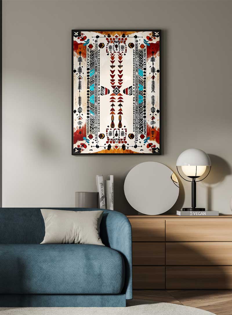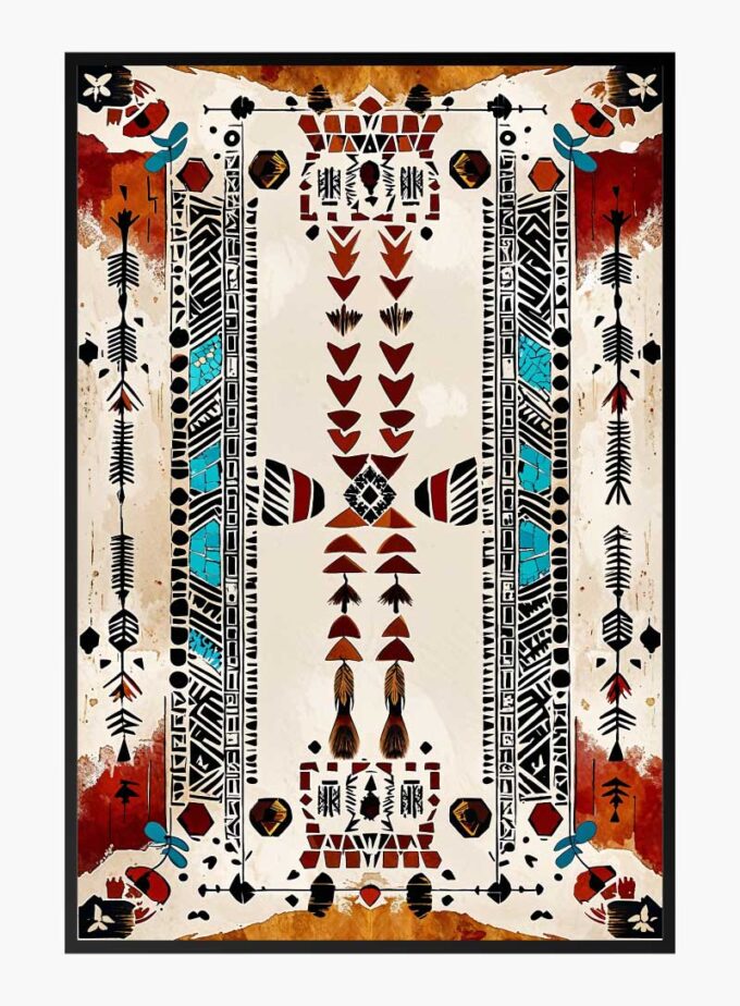 A vivid interplay of arrows, feathers, and geometric motifs brings this artwork to life. Inspired by tribal storytelling, its intricate symmetry and bold turquoise and red accents evoke the spirit of tradition and creativity. A stunning centerpiece for any room.